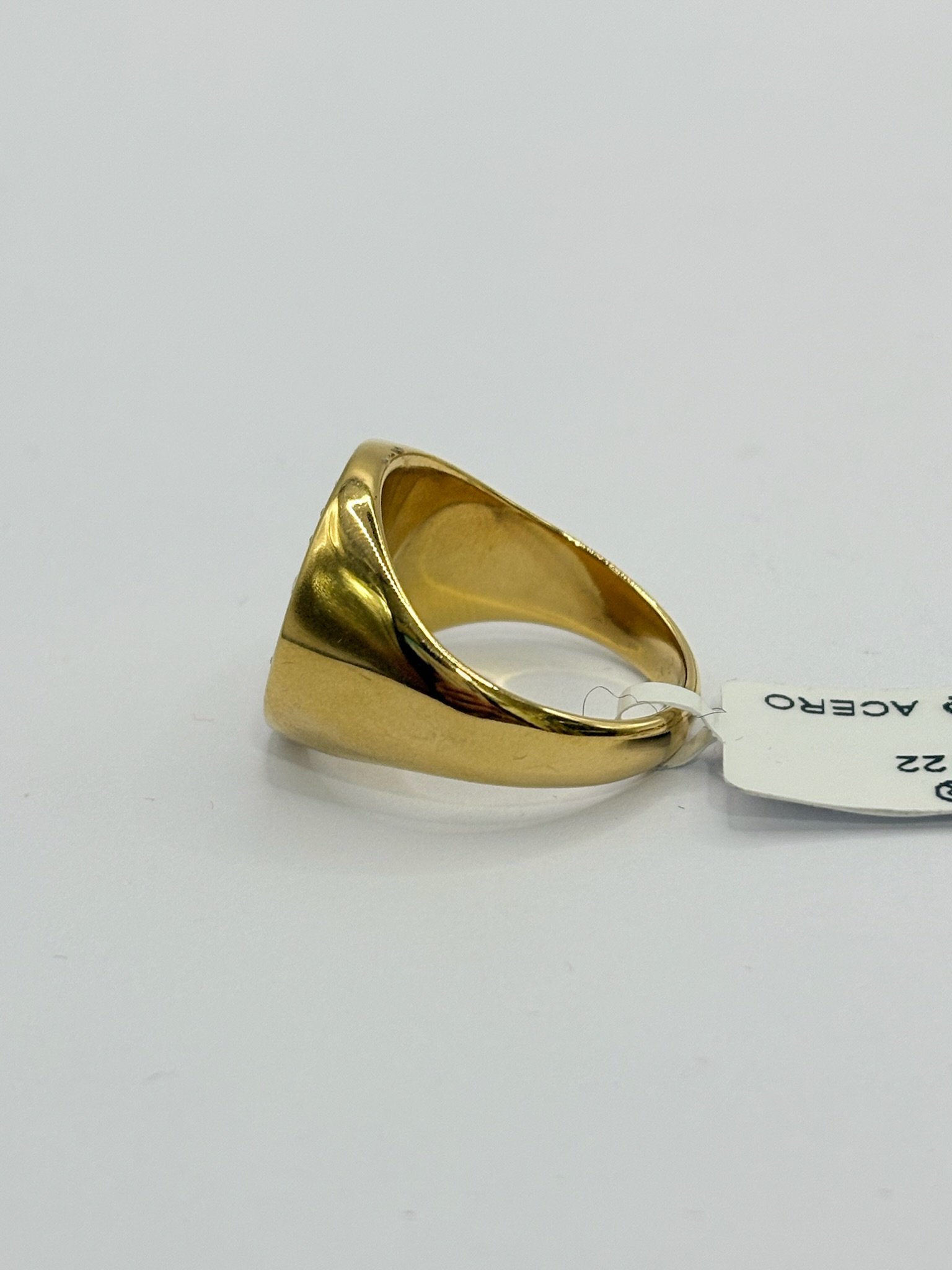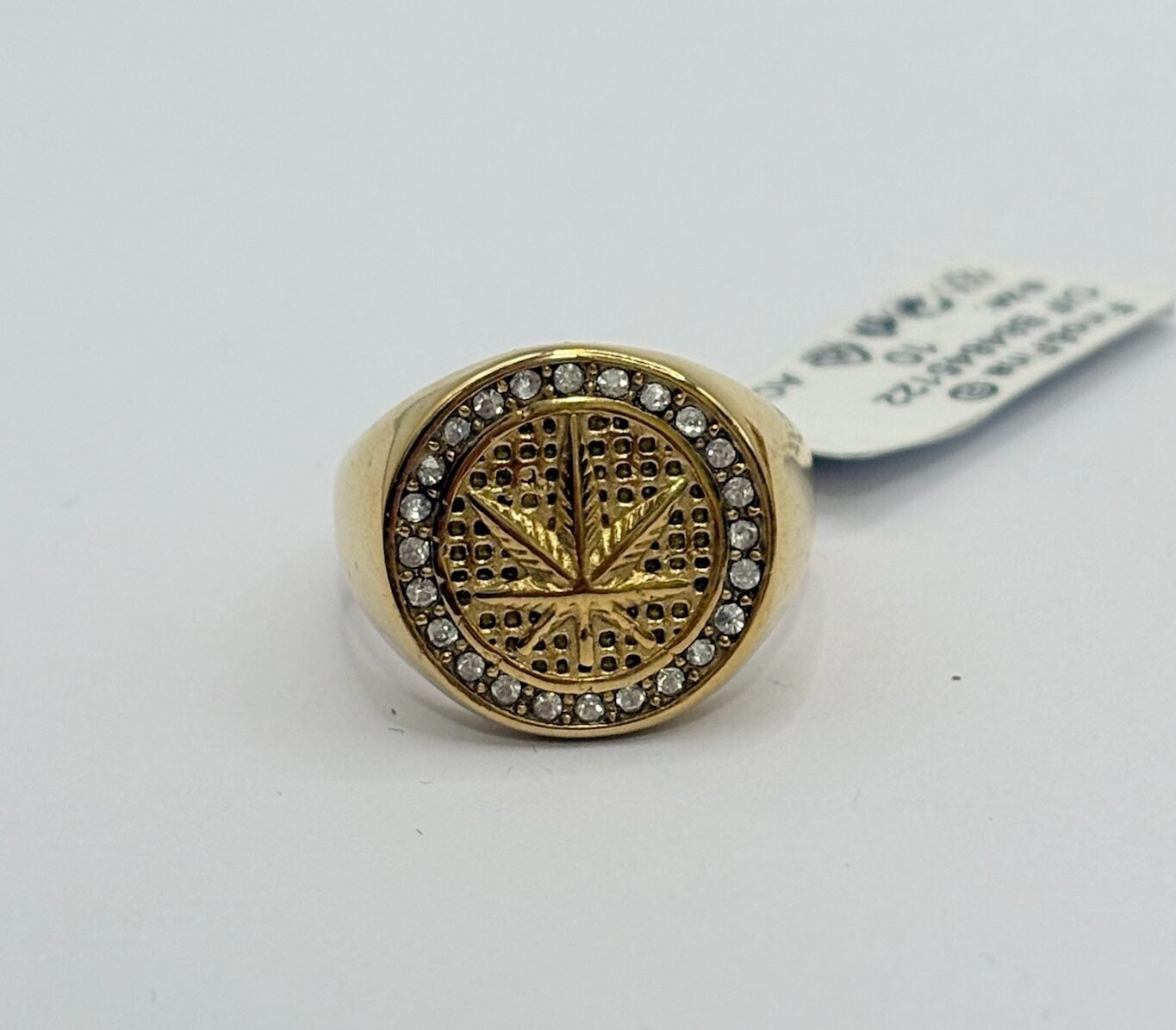 Anillo de acero inoxidable con acabado dorado, diseño elegante con hoja de cannabis en relieve sobre placa circular rodeada de cristales. Una pieza moderna que destaca por su estilo, brillo y personalidad. ✨