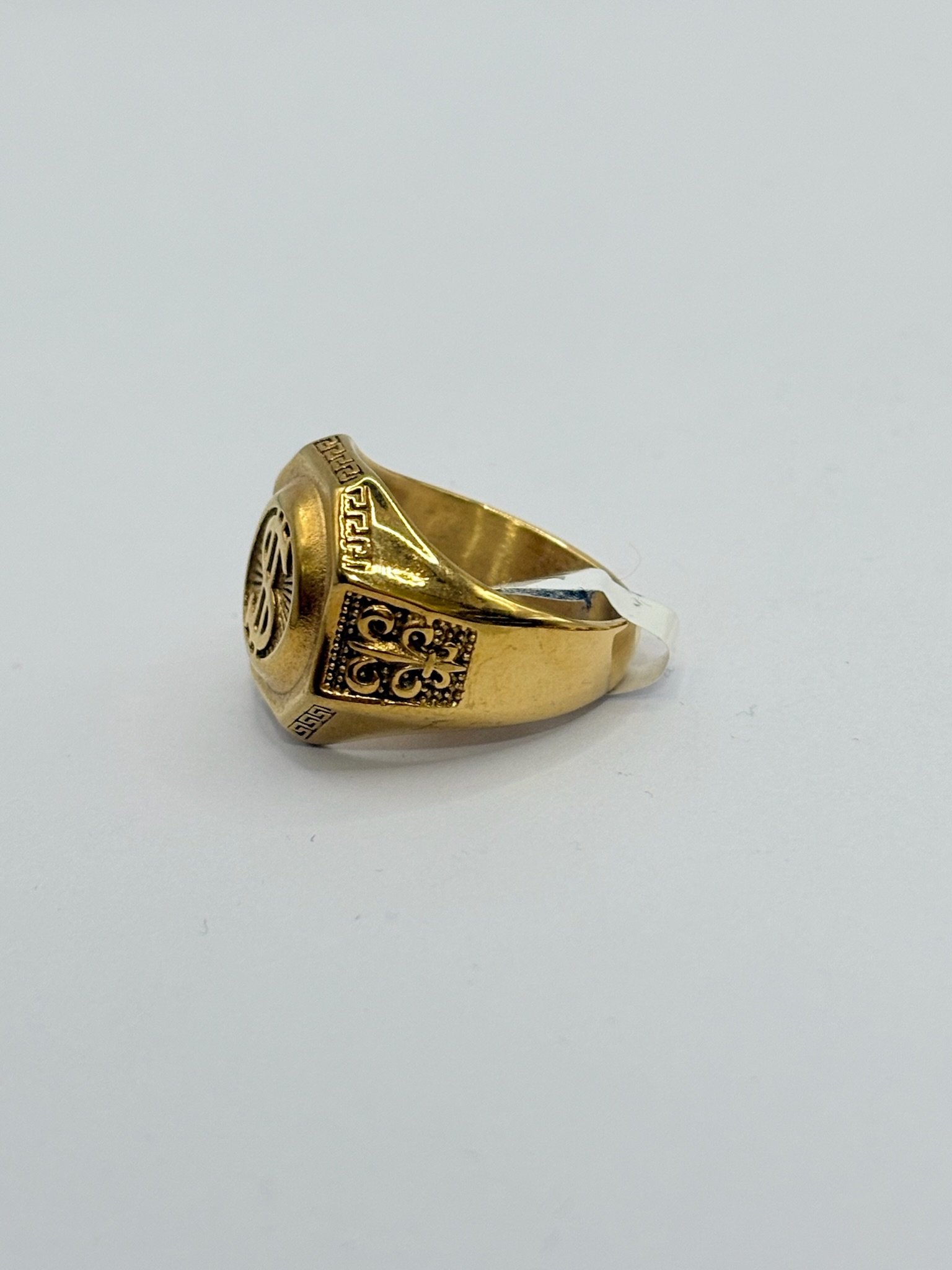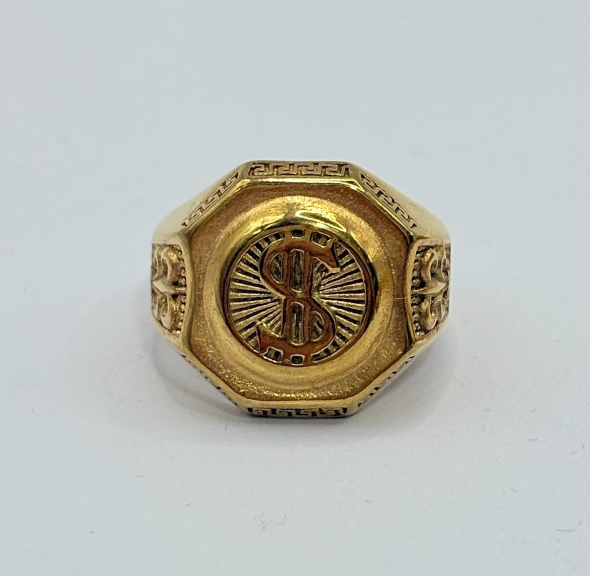Anillo de acero inoxidable con acabado dorado, diseño elegante con símbolo de dólar en relieve sobre placa octogonal y detalles grabados en los laterales. Una pieza que representa poder, ambición y estilo. ✨💲