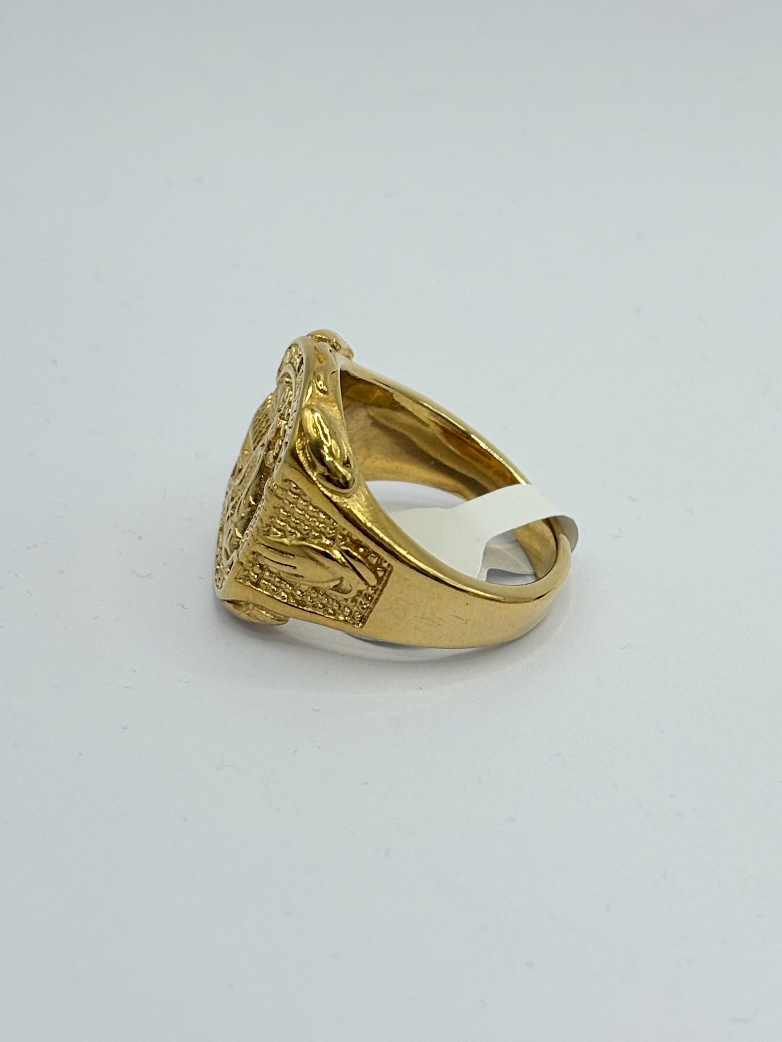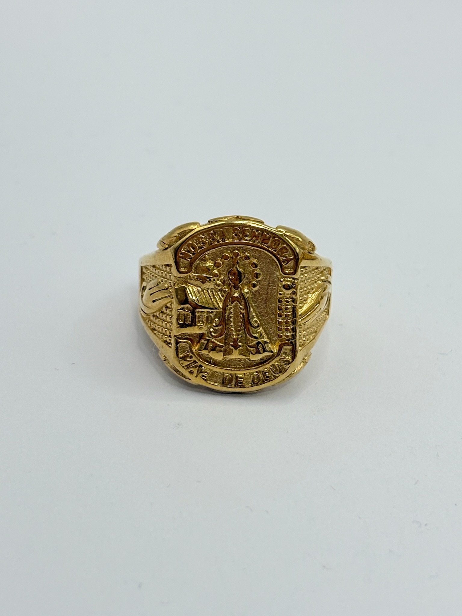 Anillo de acero inoxidable con acabado dorado, diseño religioso con imagen de la Virgen en relieve y grabado “Nossa Senhora – Mãe de Deus”. Una pieza elegante que simboliza fe, protección y devoción. ✨