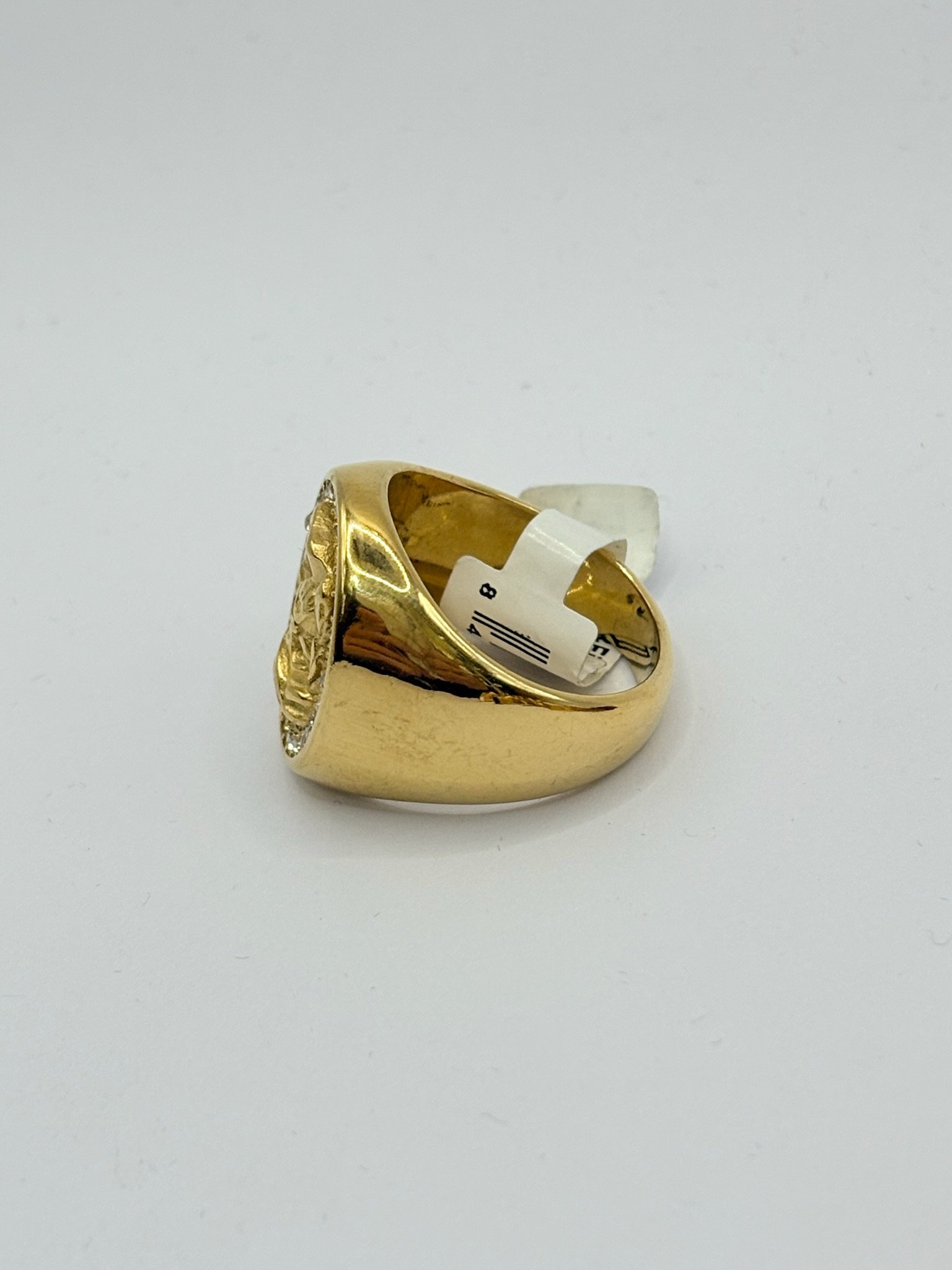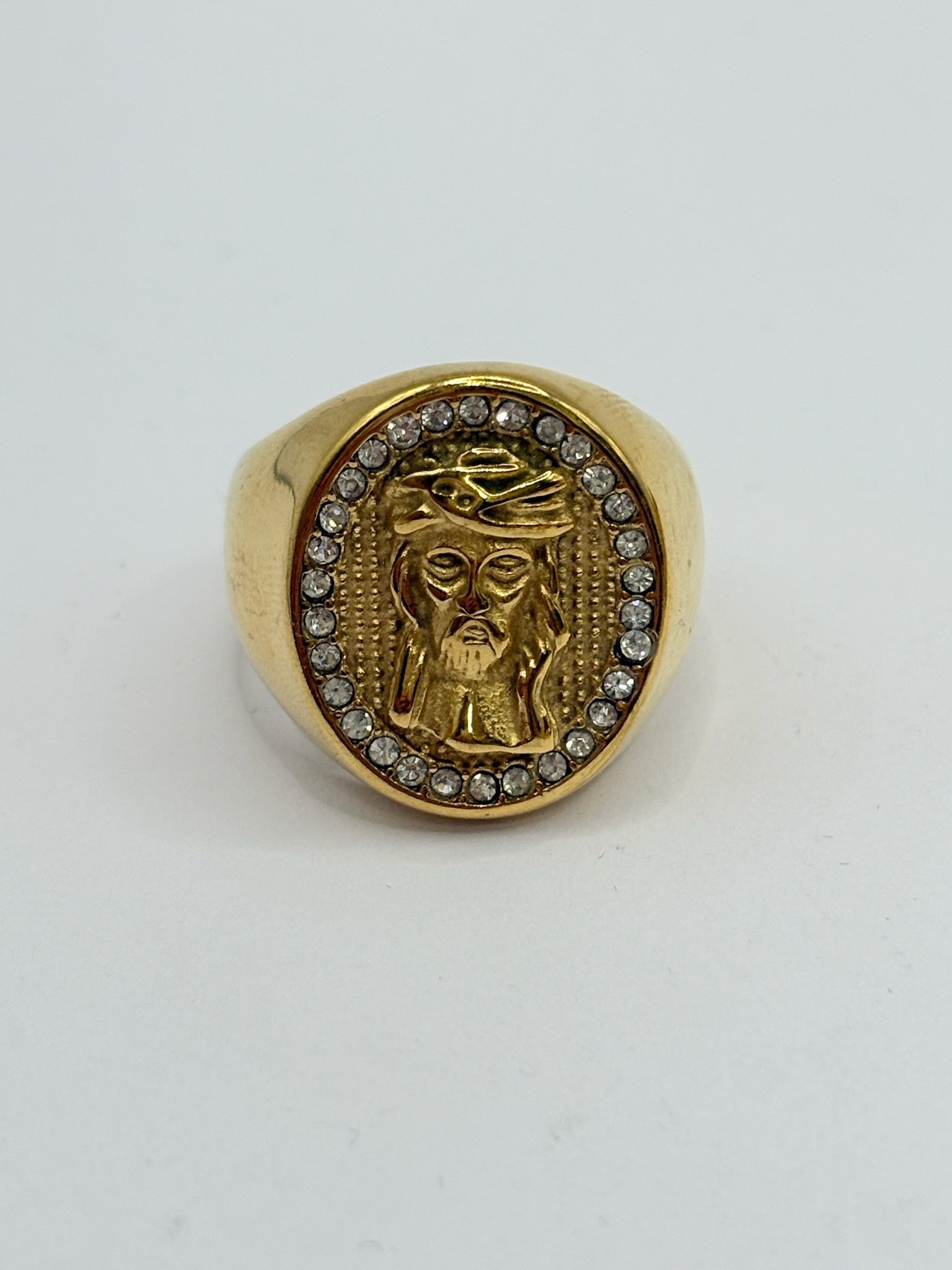 Anillo de acero inoxidable con acabado dorado, diseño religioso con rostro de Cristo en relieve rodeado de cristales brillantes. Una pieza elegante que representa fe, protección y devoción. ✨