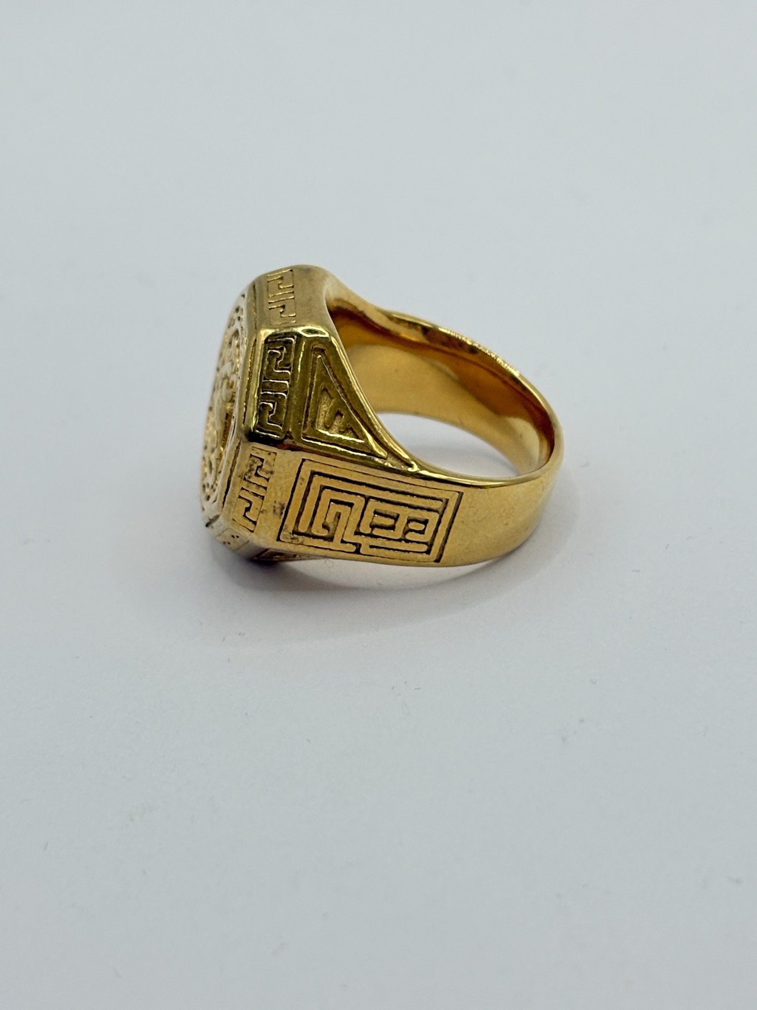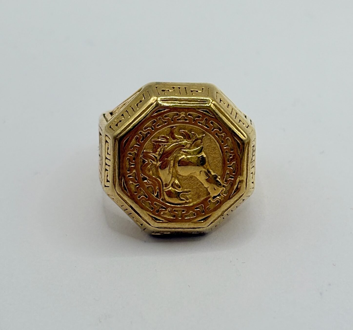 Anillo de acero inoxidable con acabado dorado, diseño elegante con cabeza de caballo en relieve sobre placa octogonal y detalles grabados alrededor. Una pieza que simboliza fuerza, elegancia y libertad. ✨🐎