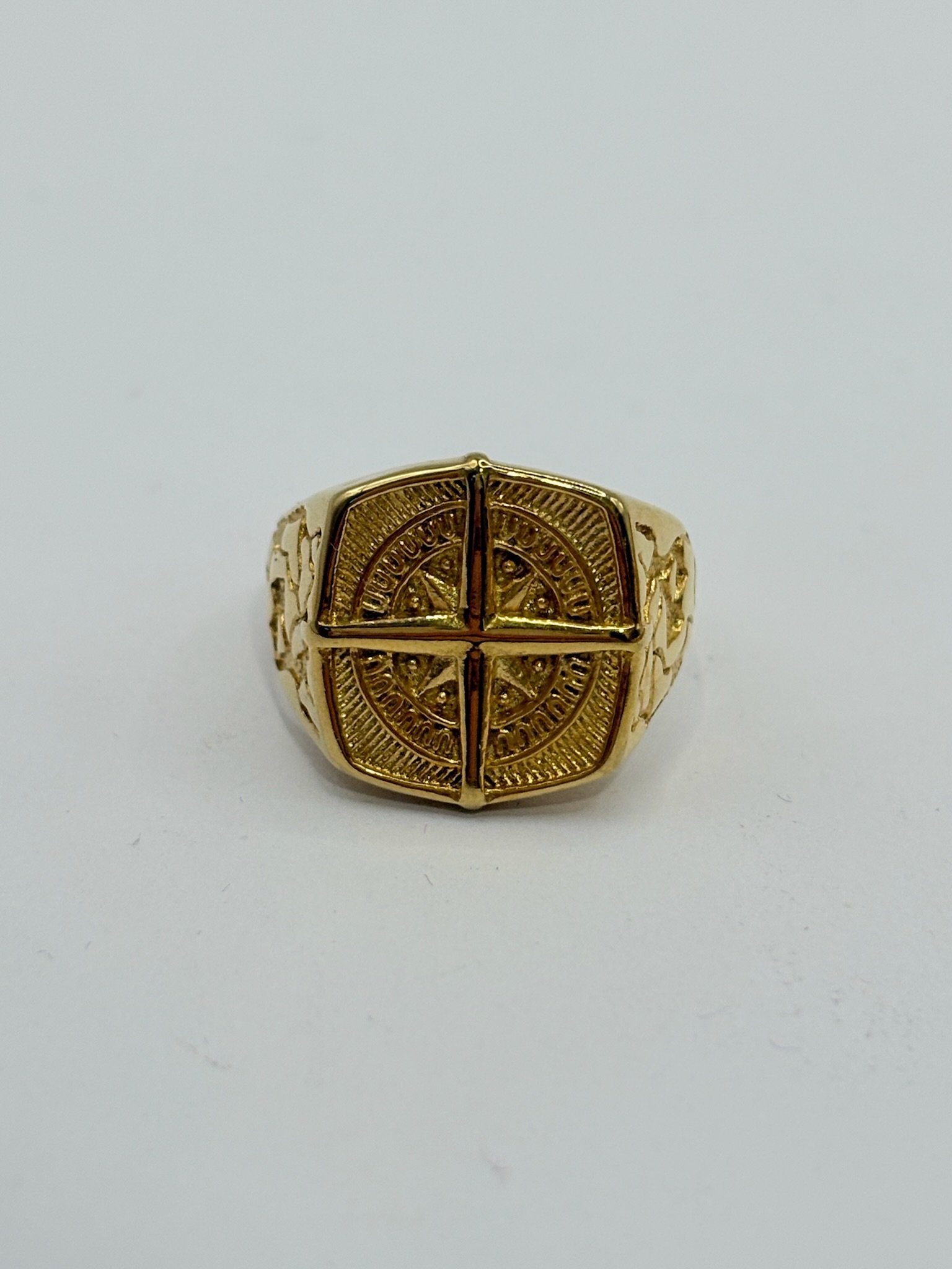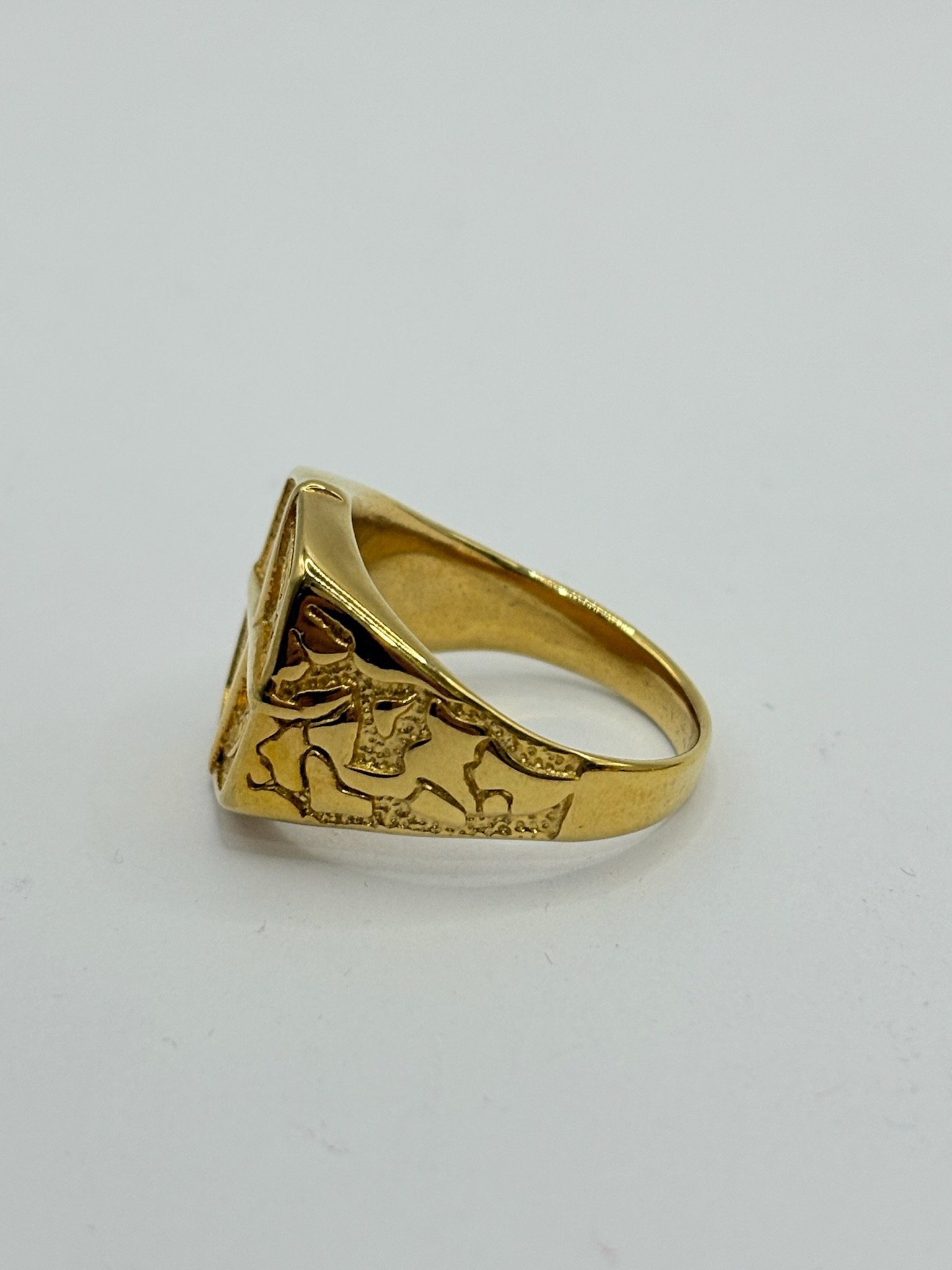 Anillo de acero inoxidable con acabado dorado, diseño elegante con cruz central en relieve y grabados detallados alrededor. Una pieza que transmite fuerza, estilo y carácter. ✨