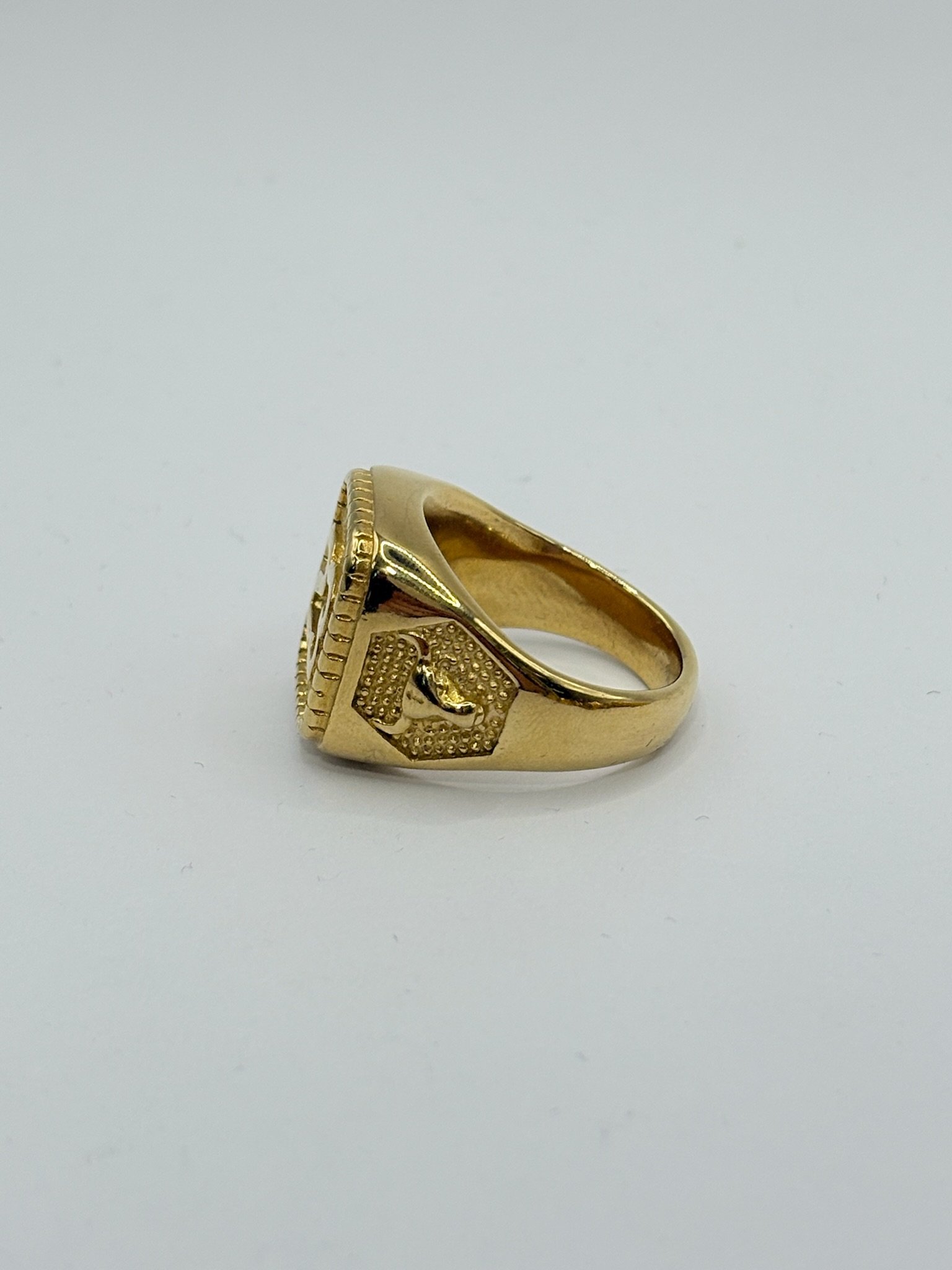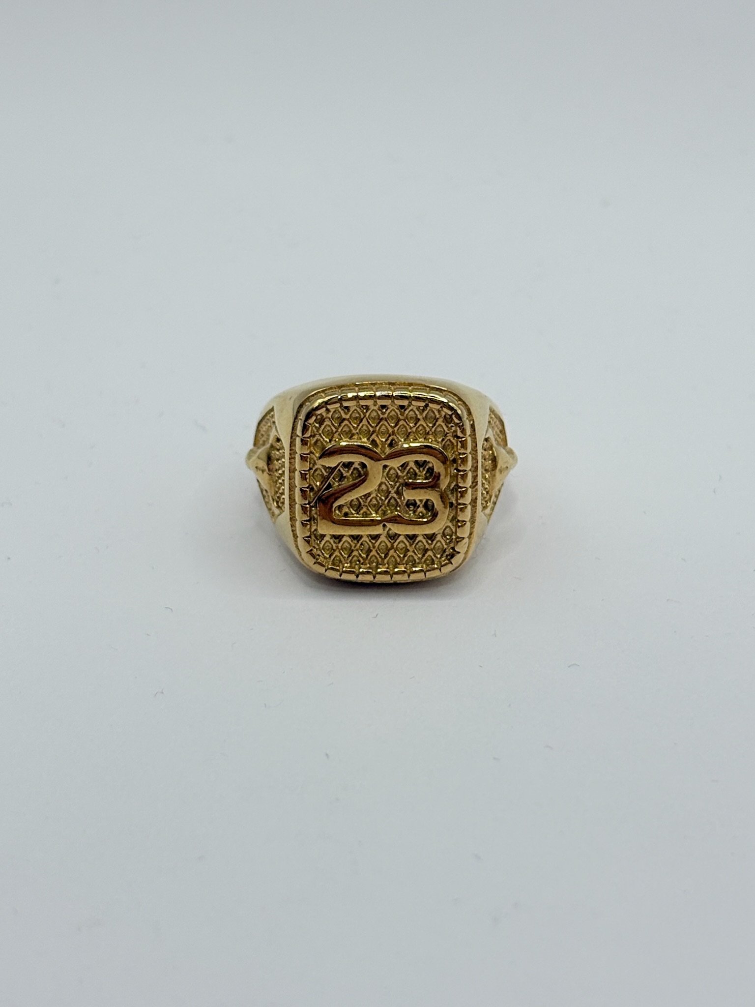 Anillo de acero inoxidable con acabado dorado, diseño elegante con número 23 en relieve sobre fondo texturizado. Una pieza moderna que destaca por su estilo exclusivo y carácter distintivo. ✨