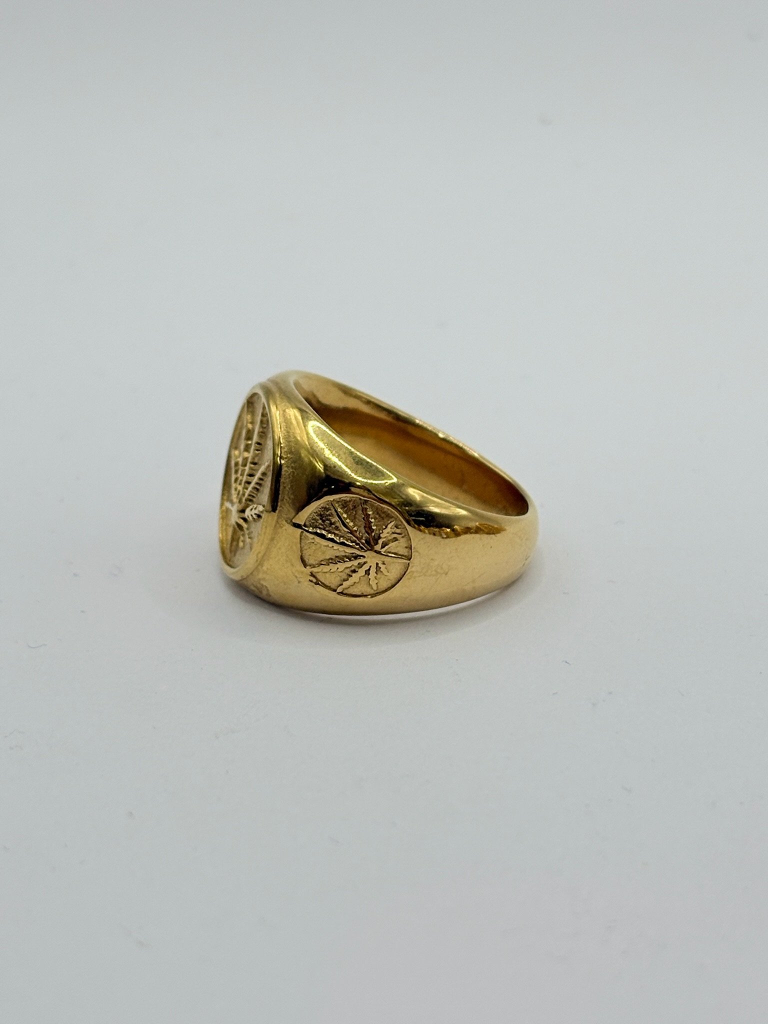 Anillo de acero inoxidable con acabado dorado, diseño moderno con hoja en relieve sobre placa circular y detalles laterales grabados. Una pieza elegante que destaca por su estilo urbano y personalidad única. ✨