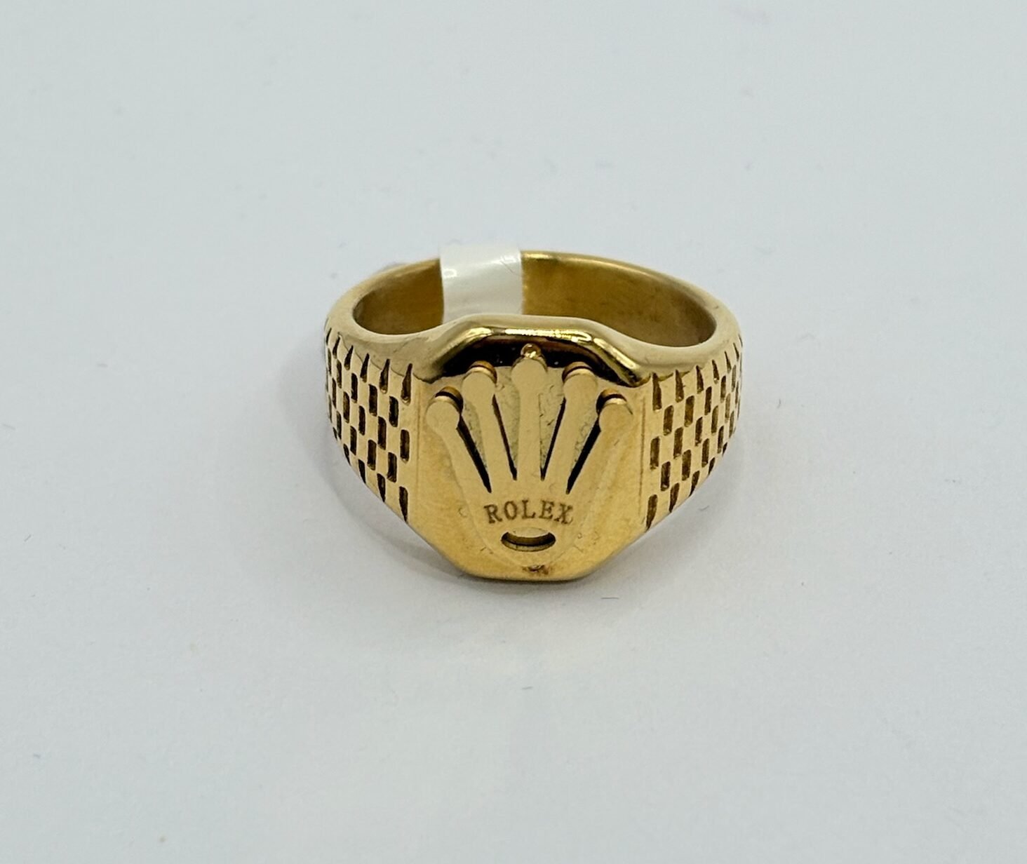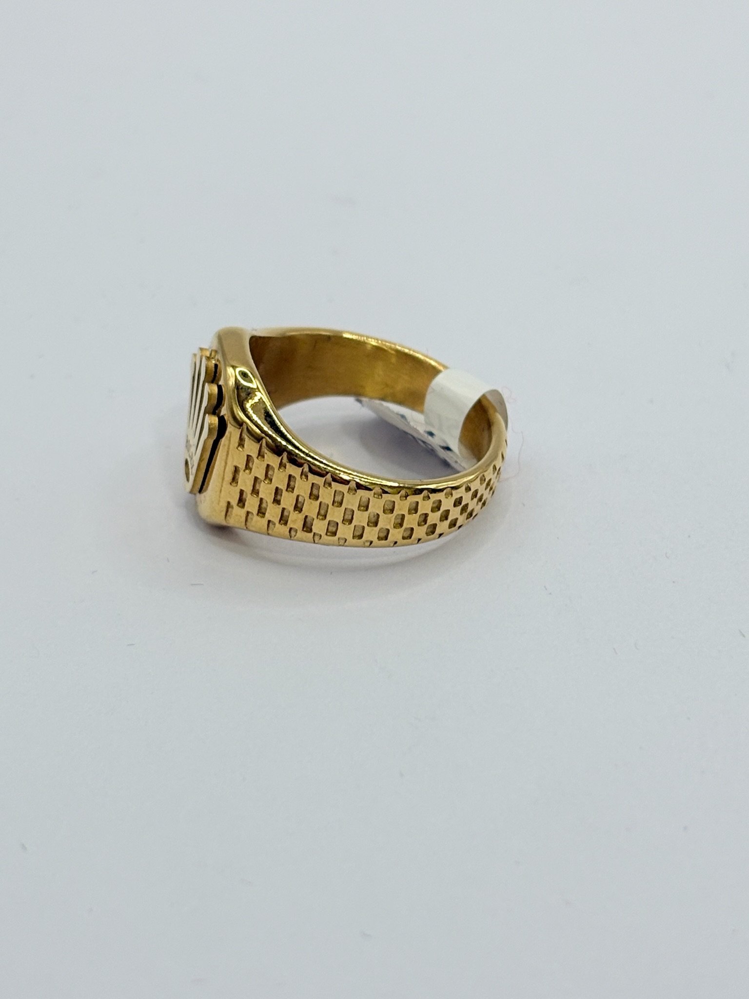 Anillo de acero inoxidable con acabado dorado, diseño elegante con corona en relieve y detalles texturizados en los laterales. Una pieza que destaca por su estilo clásico, sofisticado y distinguido. ✨