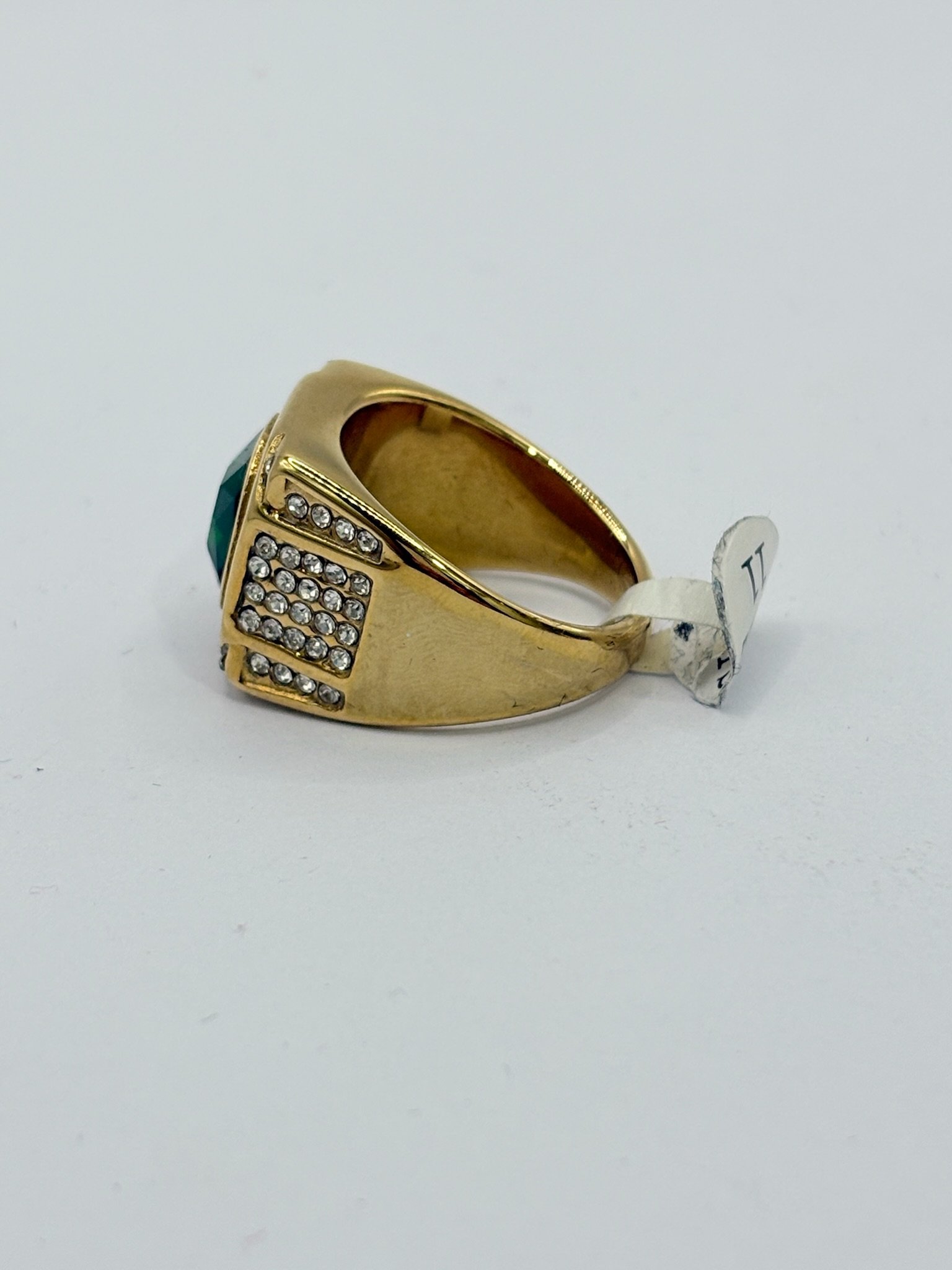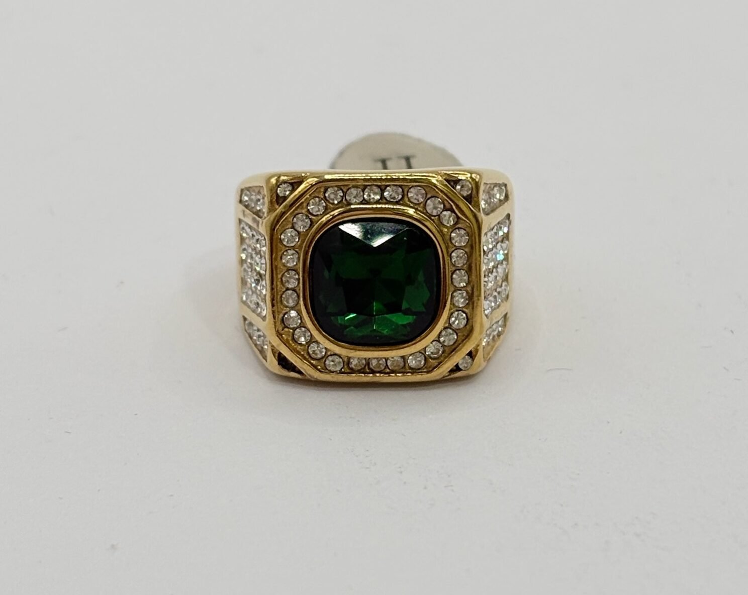 Anillo de acero inoxidable con acabado dorado, diseño elegante con piedra verde central y detalles de cristales brillantes alrededor. Una pieza sofisticada que aporta distinción, brillo y estilo exclusivo. ✨