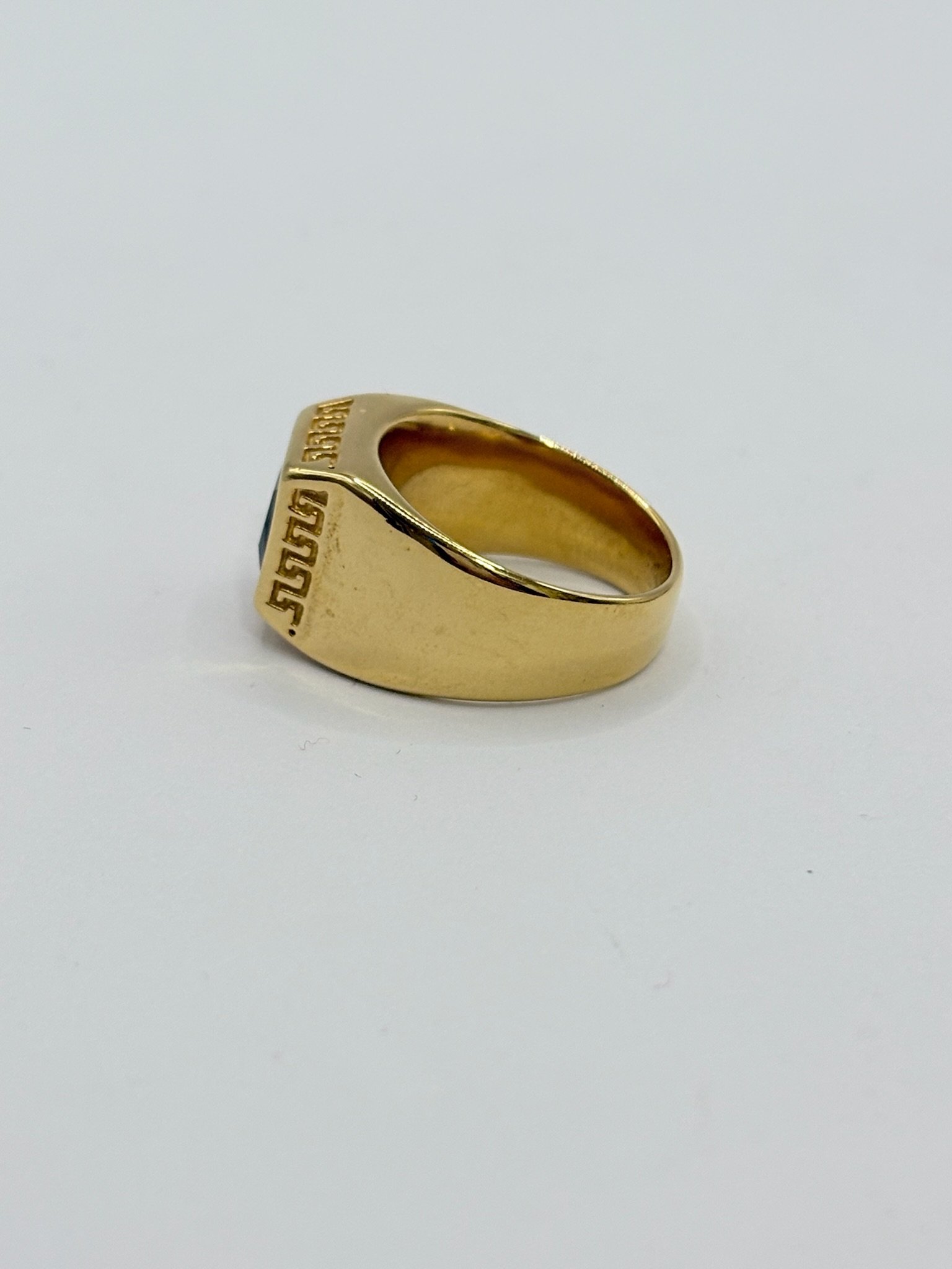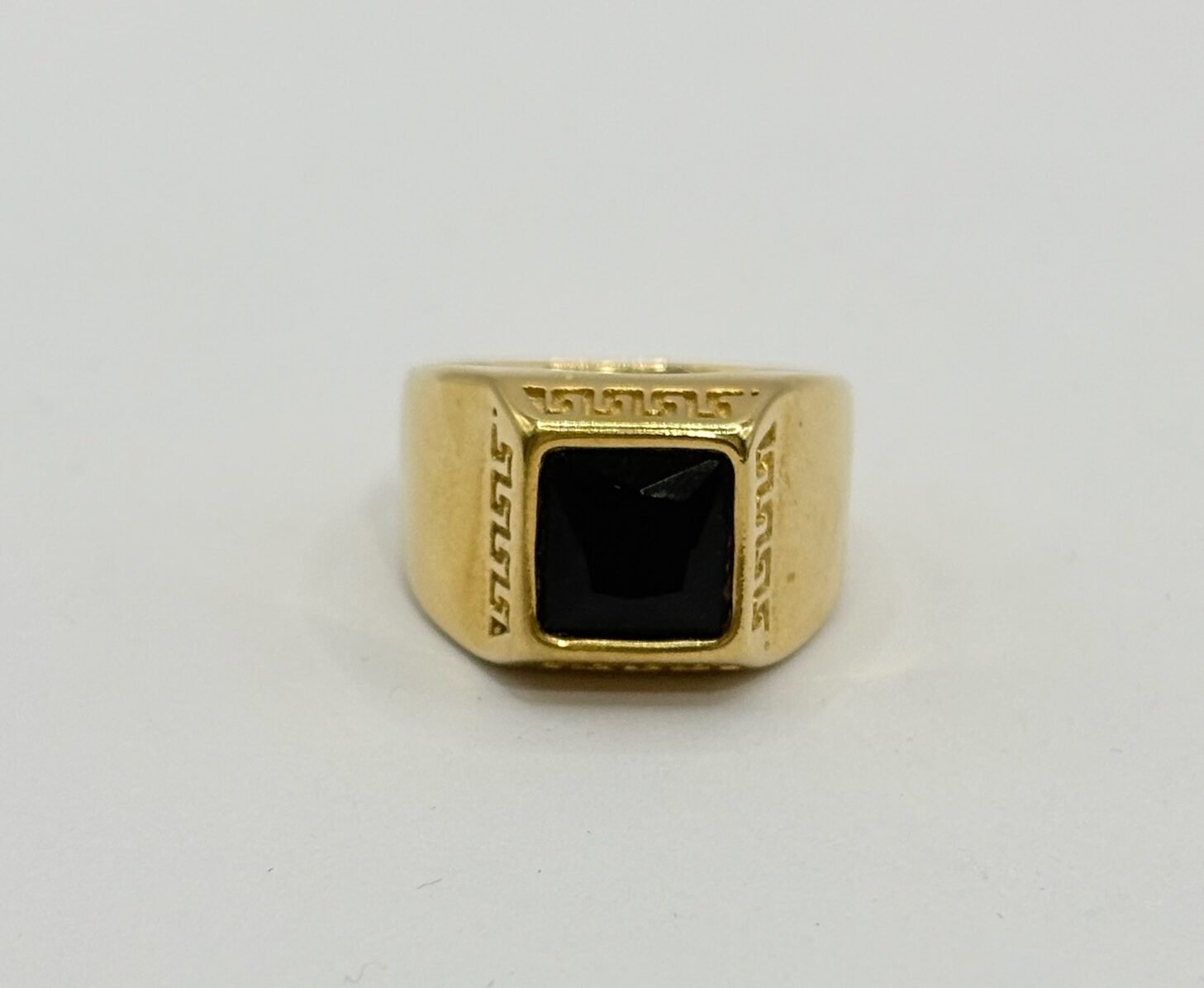 Anillo de acero inoxidable con acabado dorado, diseño elegante con piedra negra cuadrada central y grabado clásico en los laterales. Una pieza sobria y sofisticada que aporta estilo, fuerza y distinción. ✨