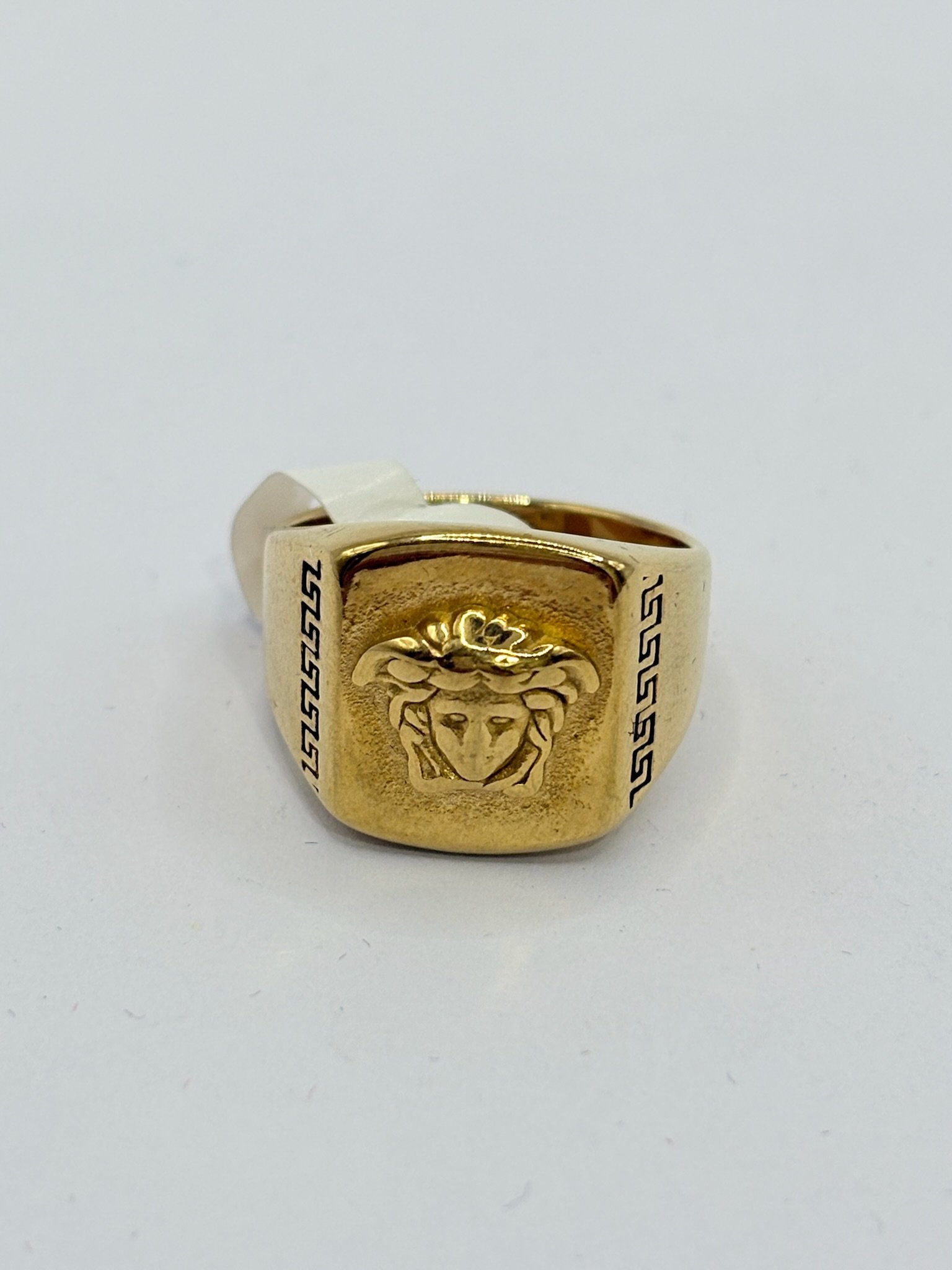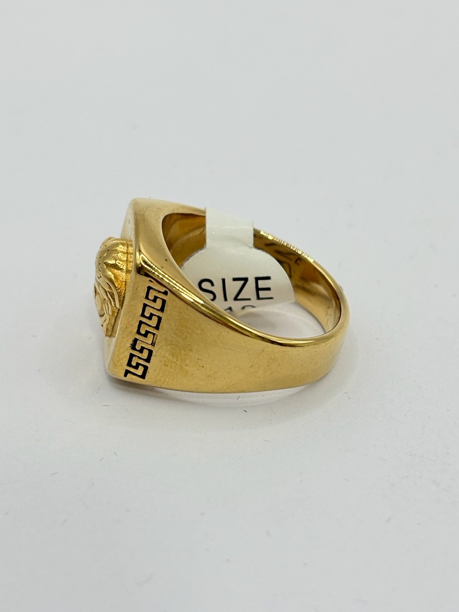 Anillo de acero inoxidable con acabado dorado, diseño elegante con rostro clásico en relieve y grabados laterales decorativos. Una pieza distinguida que refleja lujo, carácter y estilo atemporal. ✨