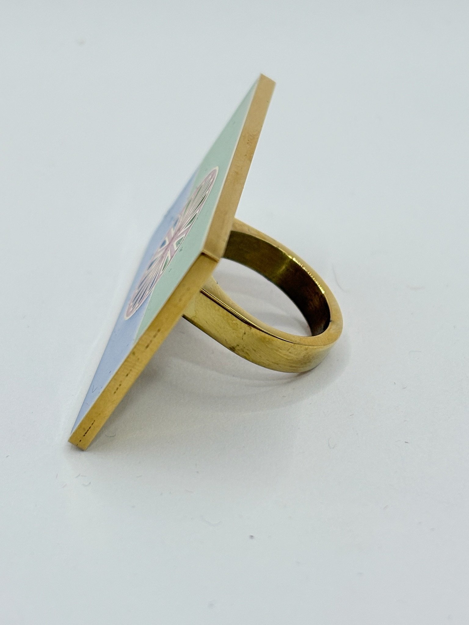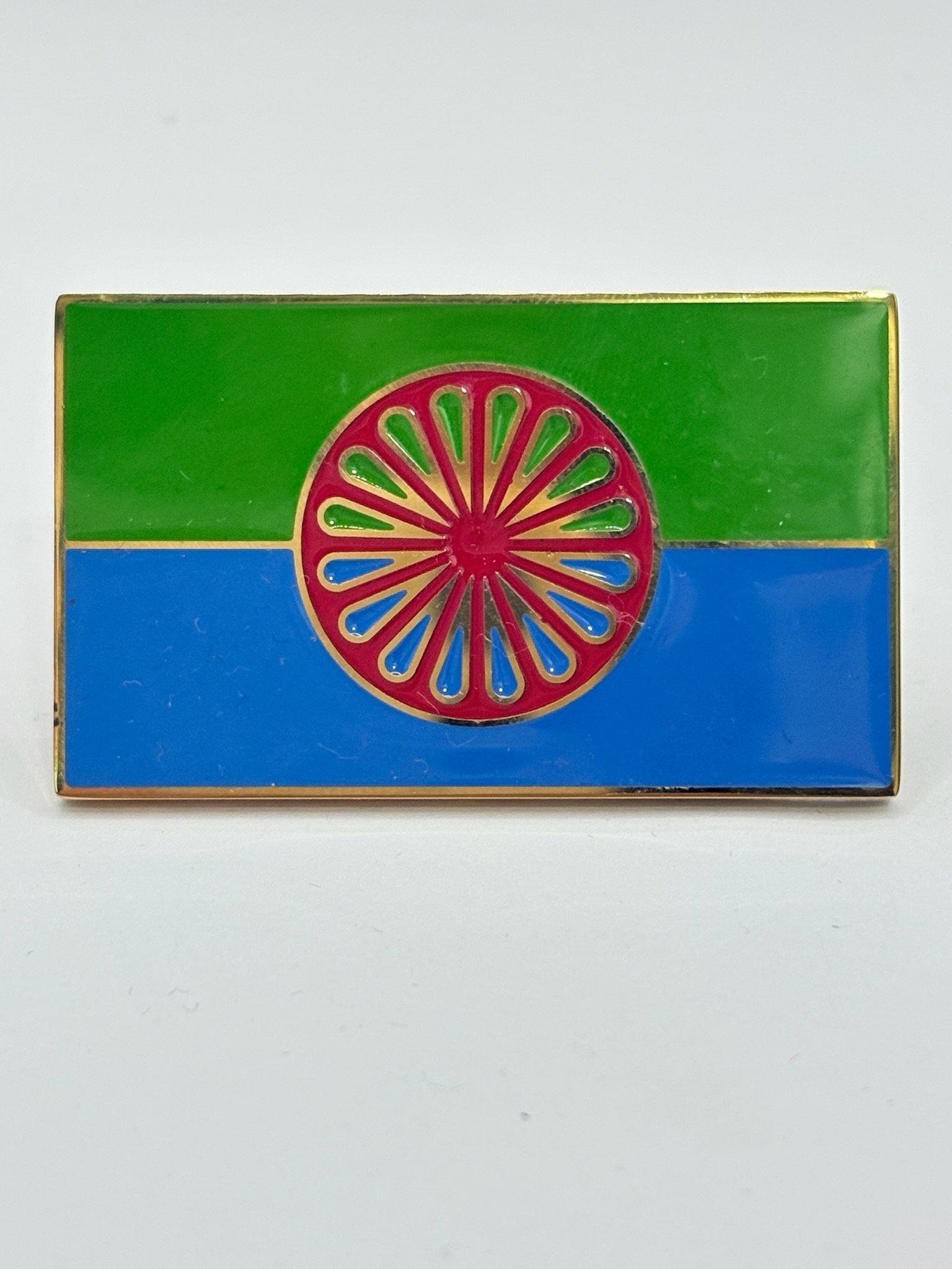 Anillo de acero inoxidable con acabado dorado, diseño llamativo con bandera gitana esmaltada en verde, azul y rojo con rueda central. Una pieza única que representa orgullo, identidad y estilo con carácter. ✨