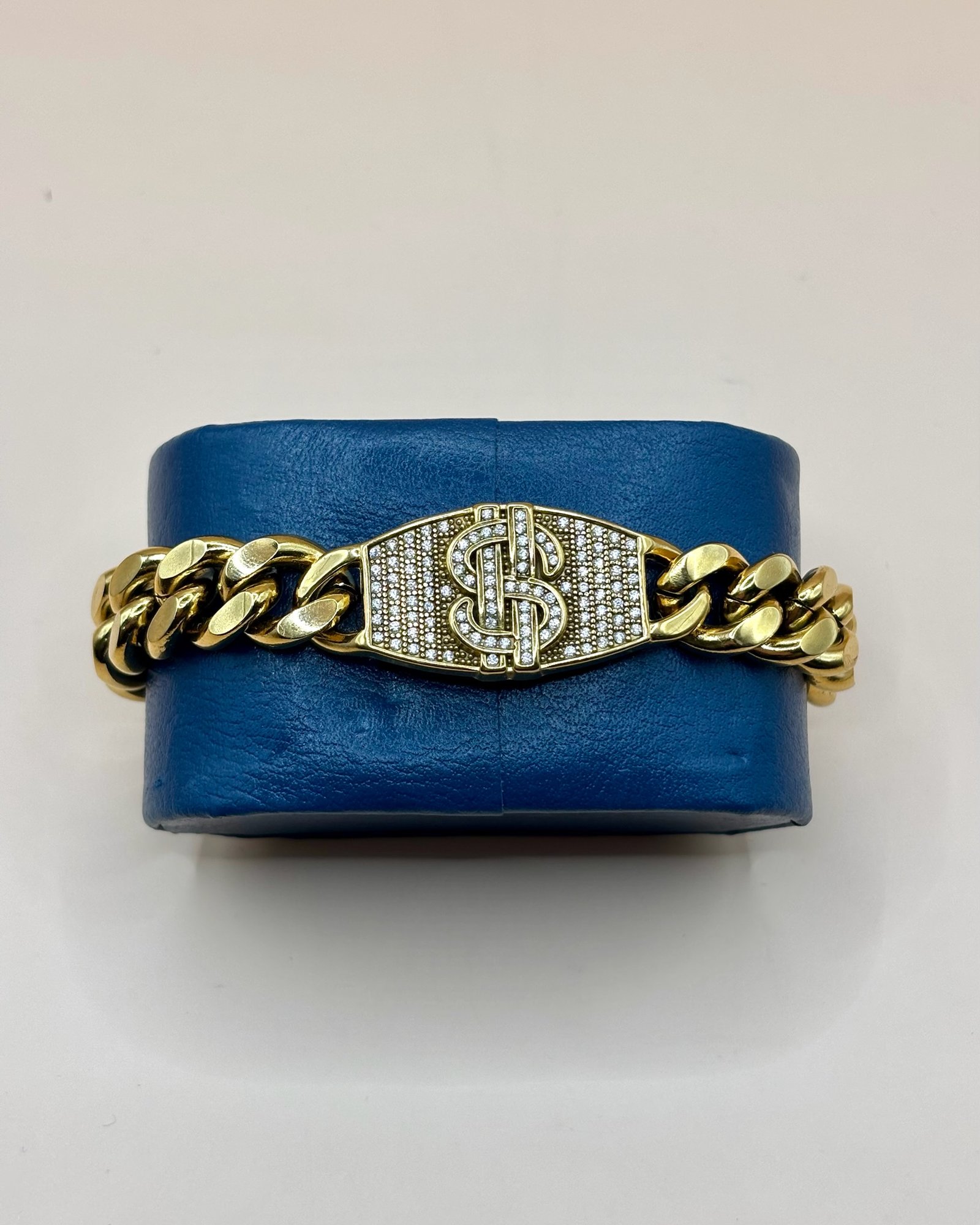 Pulsera de estilo cubano en acabado dorado, con eslabones gruesos y pulidos que aportan presencia y carácter. En el centro destaca una placa rectangular ricamente decorada con cristales brillantes, protagonizada por un símbolo del dólar en relieve que refuerza su estética urbana y lujosa.