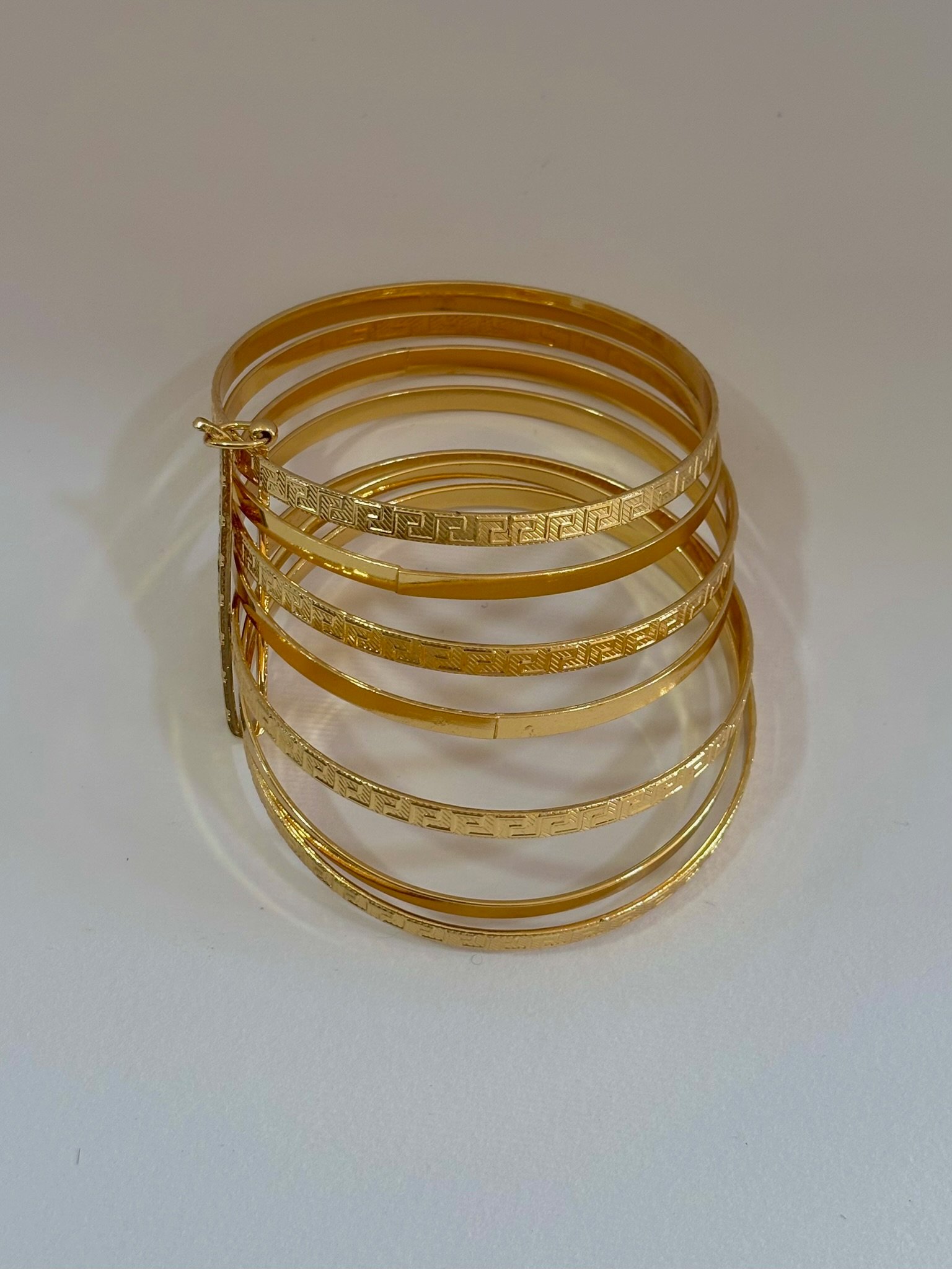 Semanario dorado que combina dos estilos en perfecta armonía: pulseras con labrado geométrico estilo Versace y pulseras lisas de acabado brillante. Un diseño equilibrado y elegante que aporta contraste, sofisticación y versatilidad, ideal para lucir juntas o combinarlas según el look. Perfecto para quienes buscan un semanario clásico con un toque distintivo y moderno.